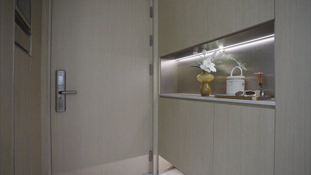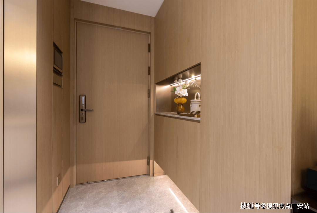 项目入户门采用高端品牌金凯德的钢木复合门,搭配金属不锈钢包边,建面约106㎡门面面宽为1米,宽于一般入户门的90cm门框,并配备博世4合1智能密码锁,高端大气的同时方便大家具进出。